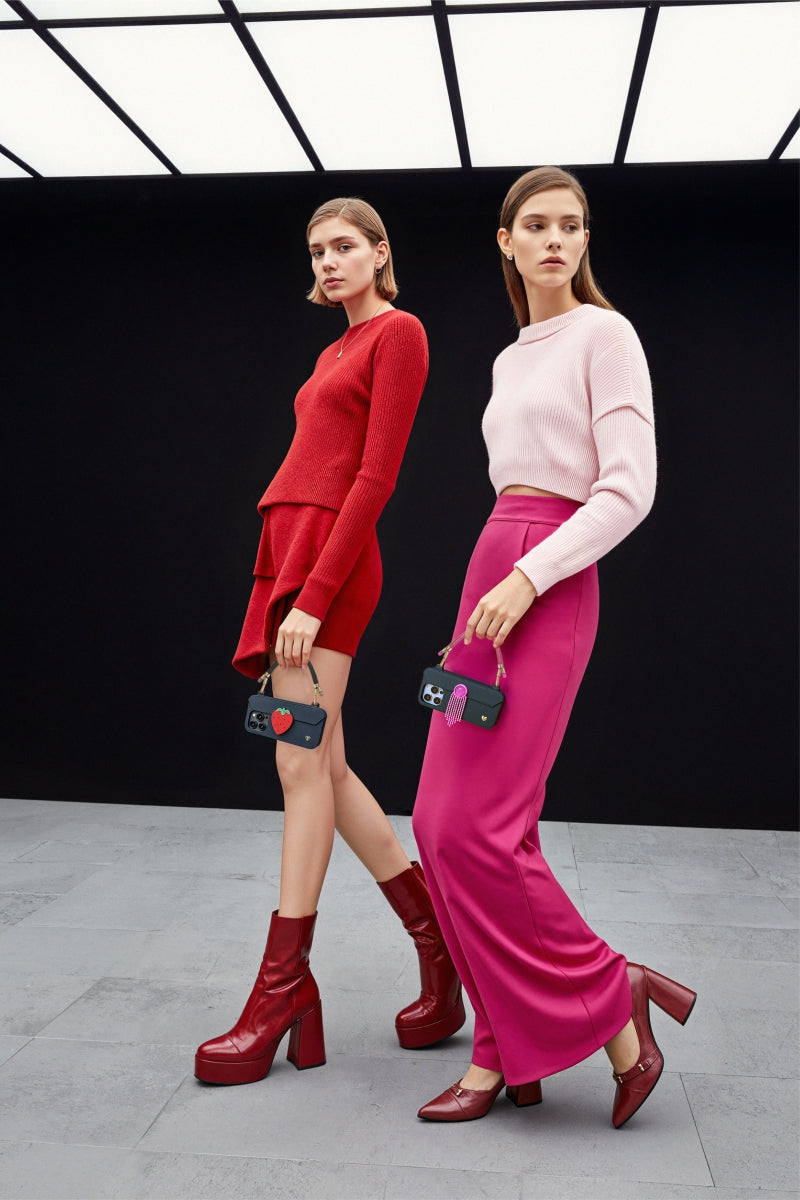 Stylish Asian professional woman posing with our silver Bling Bling crossbody strap and SOL purse case in Flamingo pink. LOVE, BRAIDED INTO EVERY DETAILS.